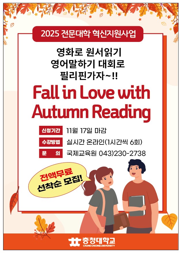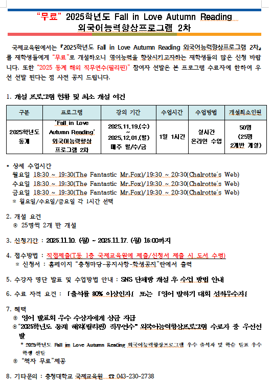학생공지 학생공지 일반공지 장학/학자금 공지 감염병안내 공모/모집/시험 도서관 생활관 기부금공개 업무추진비공개 보육교원연수원 기타공고 충청대학교_대표-학생공지(대표_충청마당_공지사항_학생공지) 상세보기 - 제목, 내용, 파일, 작성자, 조회수, 작성일, 학과공지, 주소링크 정보 제공 2025학년도 "❤️Fall in Love Autumn Reading 외국어능력향상프로그램2차❤️" 안내 작성자 : 김아진 작성일 : 2025-11-13 조회 : 56 . 파일 jpg 문서 포스터.jpg hwp 문서 2025학년도 외국어능력향상프로그램 개설 안내문.hwp hwp 문서 2025학년도 외국어능력향상프로그램 참가신청서.hwp png 문서 12345.png 주소링크 목록 게시물삭제 광고 반복작성 욕설 본인삭제 게시물삭제 이전글 [교수학습지원실] 교과·비교과 과정설계 공모전 참가신청 안내 다음글 2025학년도 2학기 중간 강의평가(간호학과 블록수업) 설문 실시
